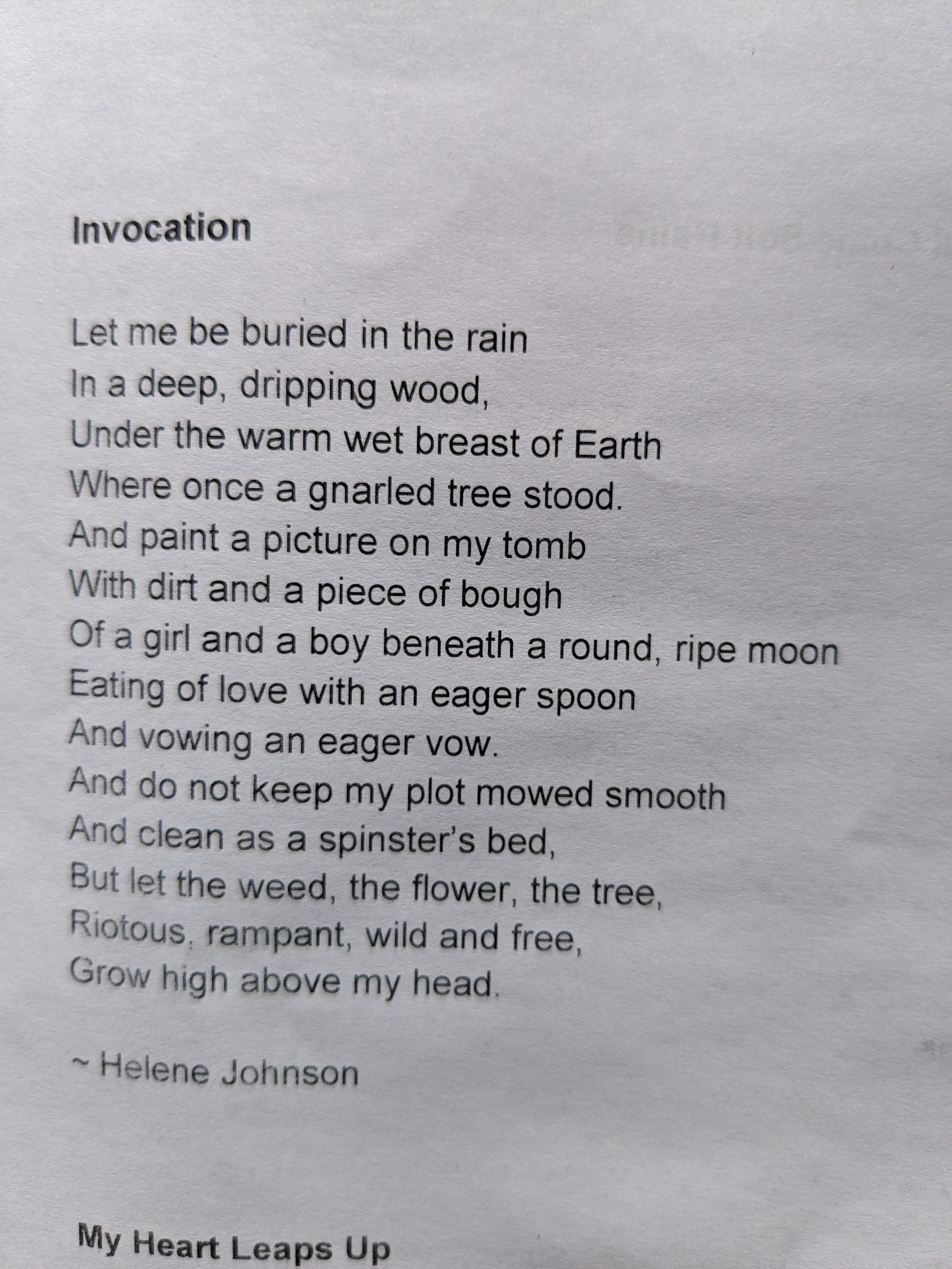 I take my yellow A4 sign, tie it to the railings, and read out a nature poem before sitting in meditation for ten minutes. This month I will be reading the poems that you are reading alongside me for Kissing the Earth.